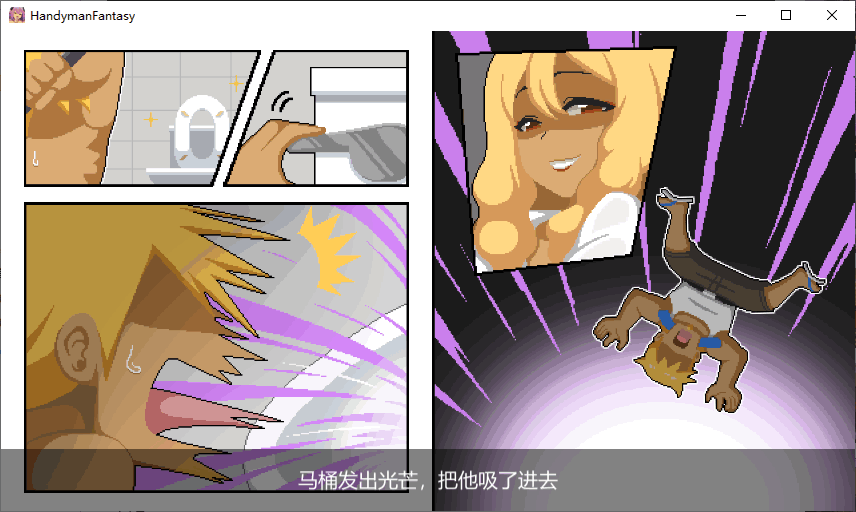 就在他修好了马桶,按下冲水测试时,马桶发出了光芒,将他吸了进去。