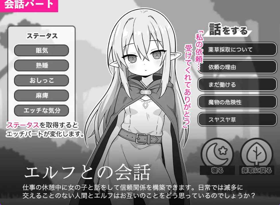 根据选择的不同,故事可能会产生分支,还可能通过获得特殊状态,增加之后在 “呼呼大睡” 色情环节中能做的事情。