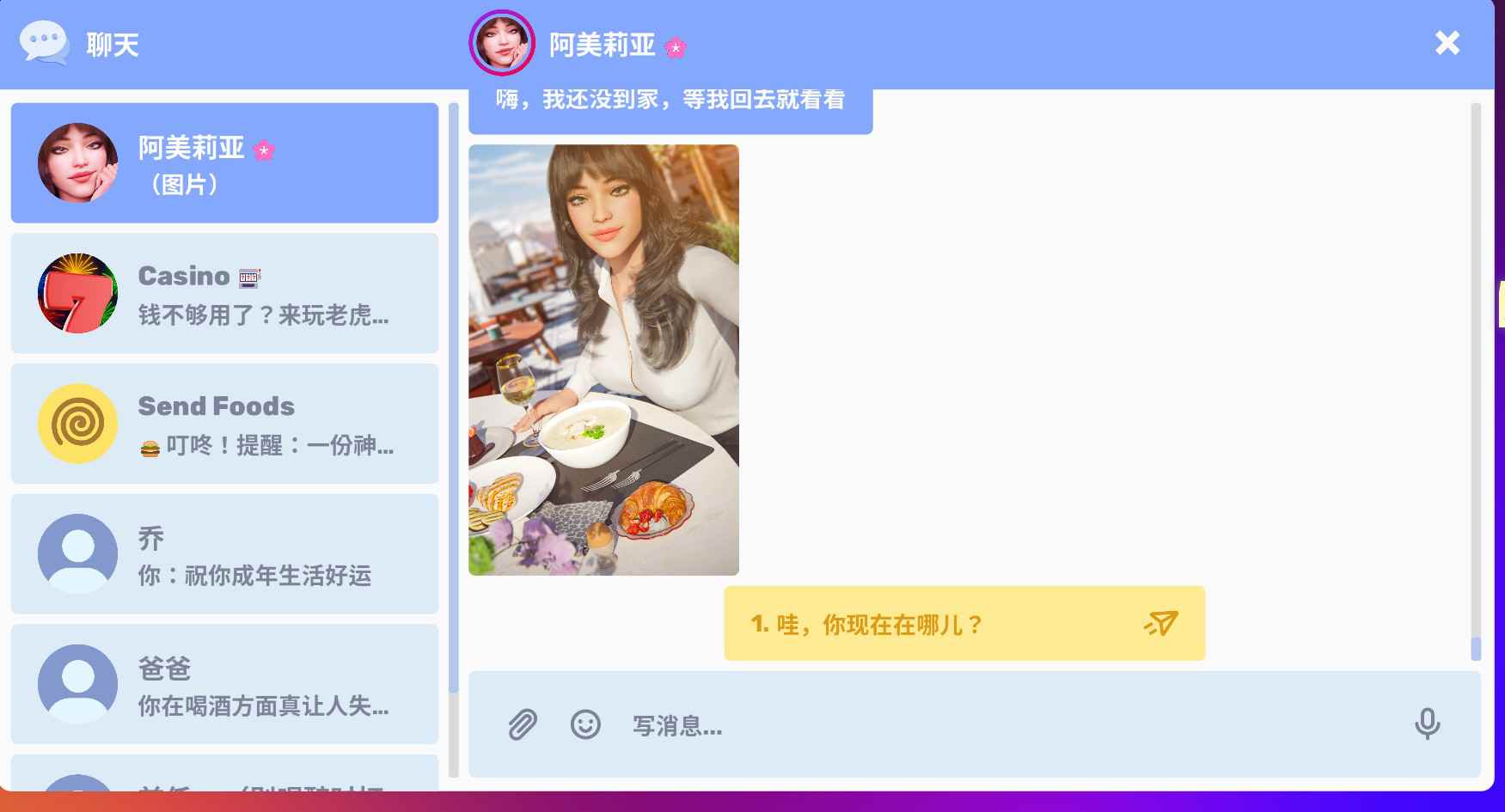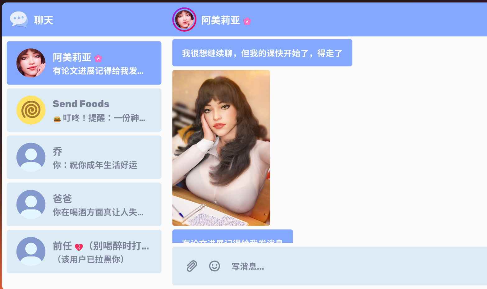 这是一款文字聊天模拟游戏,你需要帮助一位名叫阿梅莉亚的女孩完成她的硕士论文。幸运的是,你正好是最适合帮她的人……
